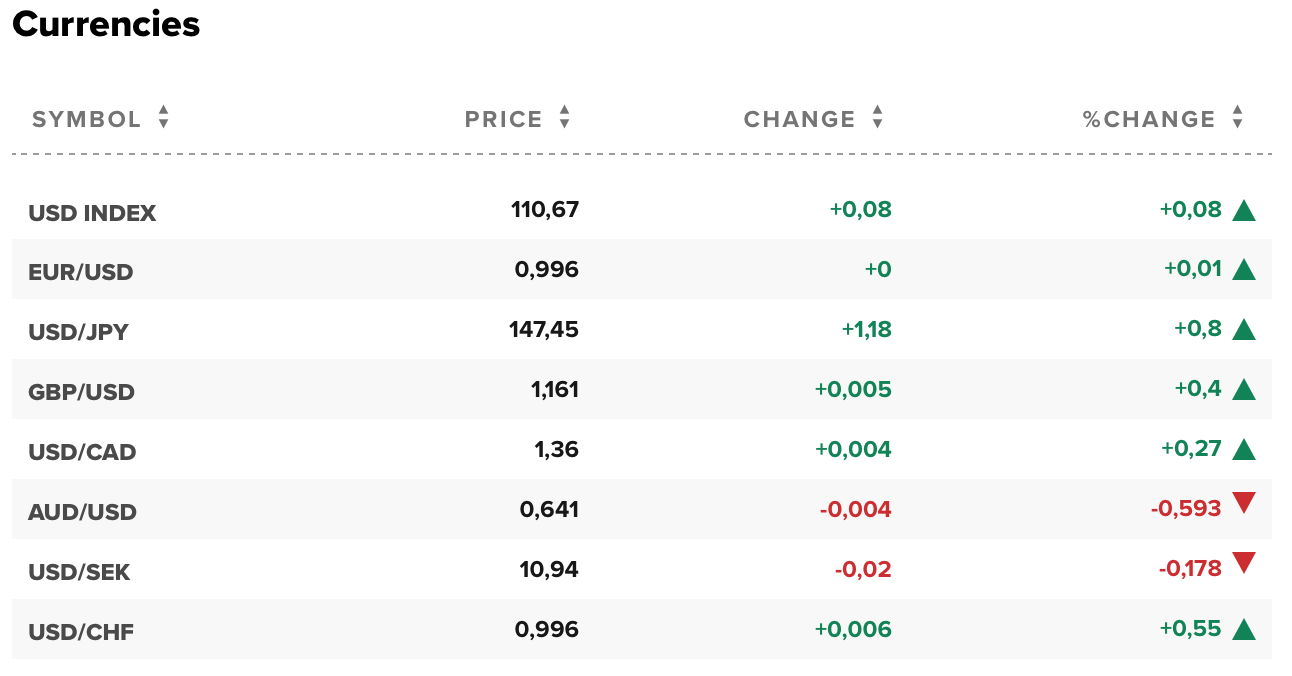 Hiện 1 euro đổi 0,996 USD. 1 bảng Anh đổi 1,161 USD. 1 USD đổi 147,45 yên. 1 USD đổi 1,36 đô la Canada. 1 đô la Úc đổi 0,641 USD, 1 USD đổi 0,996 France Thụy Sĩ.