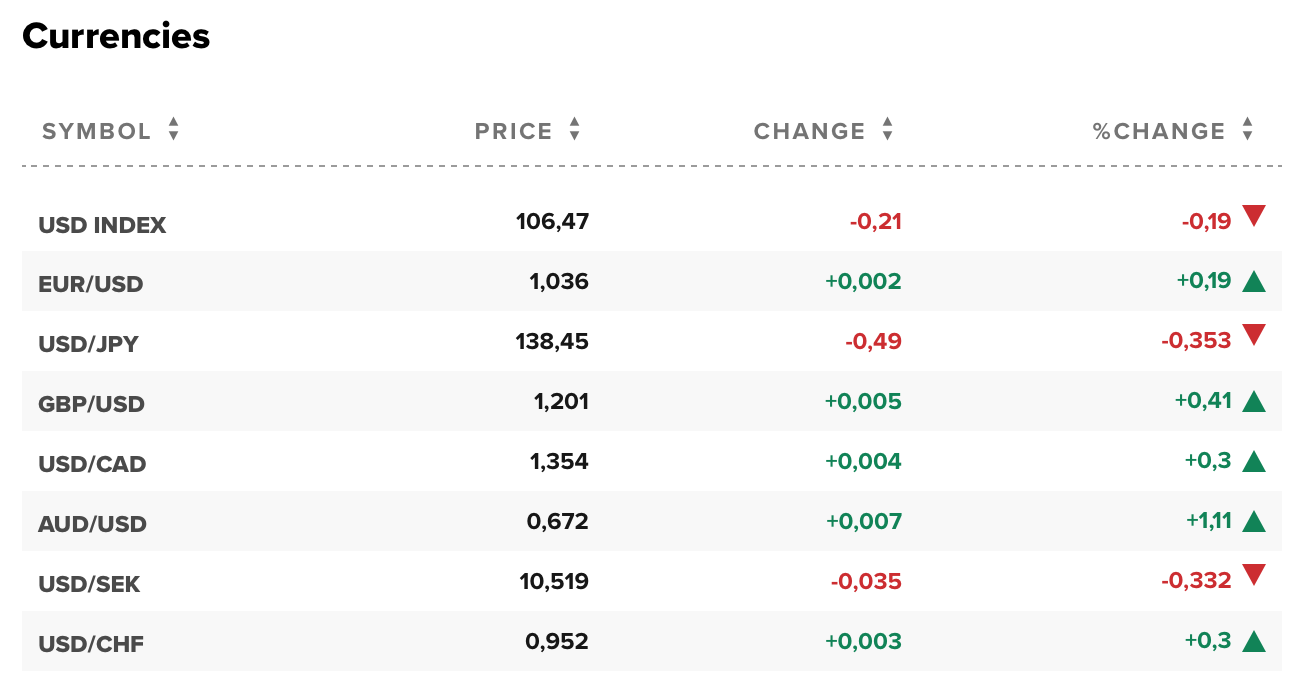 Hiện 1 euro đổi 1,036 USD. 1 bảng Anh đổi 1,201 USD. 1 USD đổi 138,45 yên. 1 USD đổi 1,354 đô la Canada. 1 đô la Úc đổi 0,672 USD, 1 USD đổi 0,952 France Thụy Sĩ.