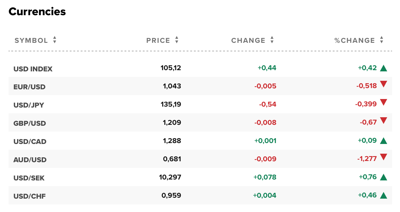 Hiện 1 euro đổi 1,043 USD. 1 bảng Anh đổi 1,209 USD. 1 USD đổi 135,19 yên. 1 USD đổi 1,288 đô la Canada. 1 đô la Úc đổi 0,681 USD, 1 USD đổi 0,959 France Thụy Sĩ.