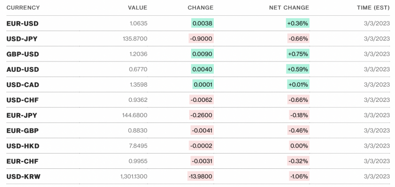Chỉ số đô la, đo lường giá trị của đồng bạc xanh so với sáu loại tiền tệ chính, đã giảm 0,3% xuống 104,60, từ mức cao nhất là 105,36 vào đầu tuần, mức cao nhất kể từ ngày 6 tháng 1. Cho đến nay, chỉ số này đã giảm 0,5 %, với tốc độ giảm phần trăm lớn nhất kể từ tuần ngày 15 tháng 1.