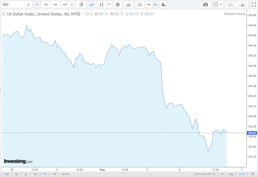 Chỉ số Dollar Index (DXY), đo lường đồng USD với 6 đồng tiền chủ chốt (EUR, JPY, GBP, CAD, SEK, CHF), đã dừng ở mức 102,67 điểm, giảm 0,56 điểm so với giao dịch ngày 5/8/2024.