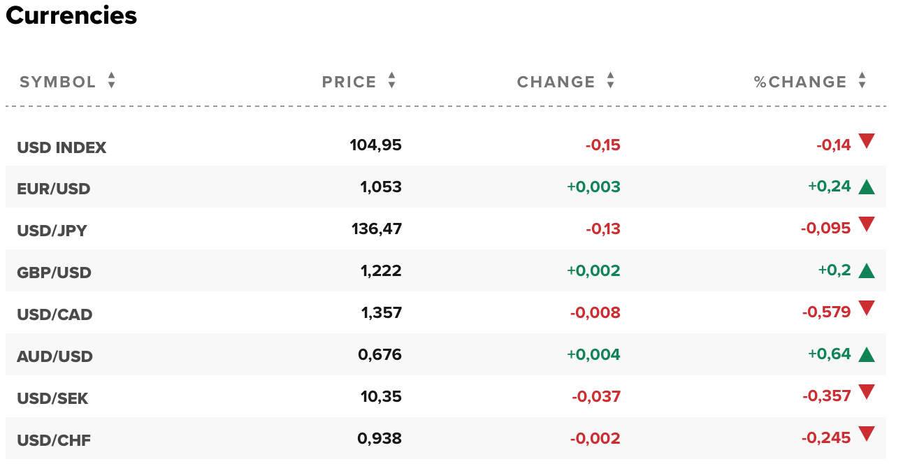 Hiện 1 euro đổi 1,053 USD. 1 bảng Anh đổi 1,222 USD. 1 USD đổi 136,47 yên. 1 USD đổi 1,357 đô la Canada. 1 đô la Úc đổi 0,676 USD, 1 USD đổi 0,938 France Thụy Sĩ.