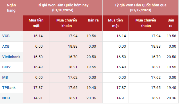 Tỷ giá Won Hàn Quốc hôm nay 01/01/2024 lúc 6 giờ 00 phút tại các ngân hàng |