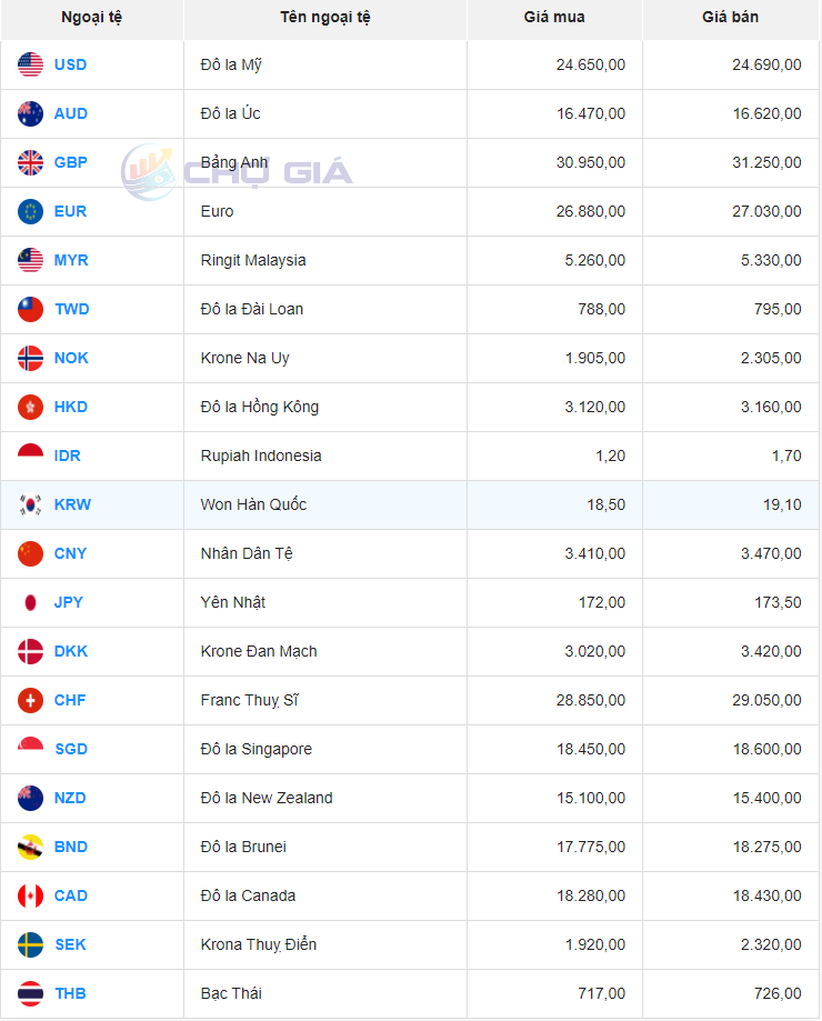 Với 8 ngoại tệ còn lại, khách hàng có thể giao dịch bằng hình thức chuyển khoản: Krone Đan Mạch (DKK), rupee Ấn Độ (INR), Dinar Kuwaiti (KWD), ringgit Malaysia (MYR), Krone Na Uy (NOK), Rúp Nga (RUB), Rian Ả-Rập-Xê-Út (SAR) và Krona Thụy Điển (SEK).