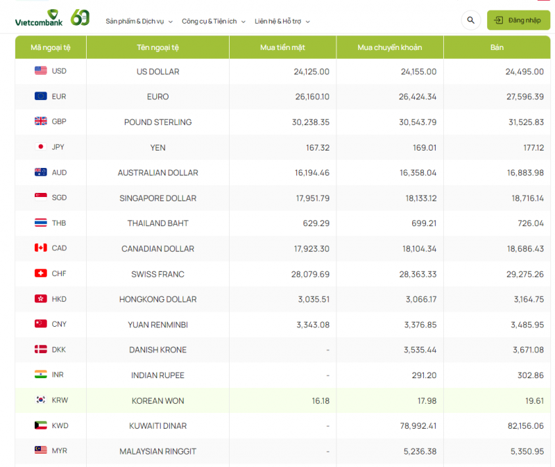 Với 8 ngoại tệ còn lại, khách hàng có thể giao dịch bằng hình thức chuyển khoản: Krone Đan Mạch (DKK), rupee Ấn Độ (INR), Dinar Kuwaiti (KWD), ringgit Malaysia (MYR), Krone Na Uy (NOK), Rúp Nga (RUB), Rian Ả-Rập-Xê-Út (SAR) và Krona Thụy Điển (SEK).