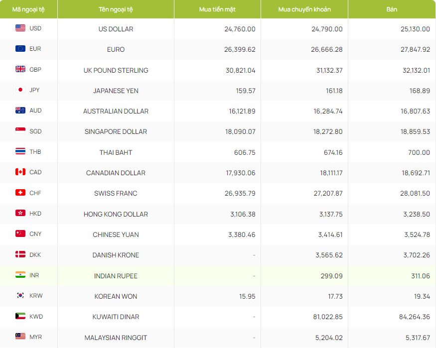Tại Vietcombank, tỷ giá Won Vietcombank chiều mua vào và chiều bán ra ở mức 15,95 VND/KRW và 19,34 VND/KRW. Tỷ giá Won tại VietinBank, chiều mua vào và bán ra là 16,64 VND/KRW và 20,24 VND/KRW.