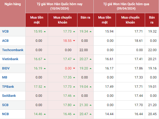 Hôm nay 10/4/2024, Ngân hàng Tiên Phong mua Won Hàn Quốc (KRW) giá cao nhất là 17.52 VNĐ/KRW. Bán Won Hàn Quốc (KRW) thấp nhất là Ngân hàng Quốc Dân với 20.47 VNĐ một KRW