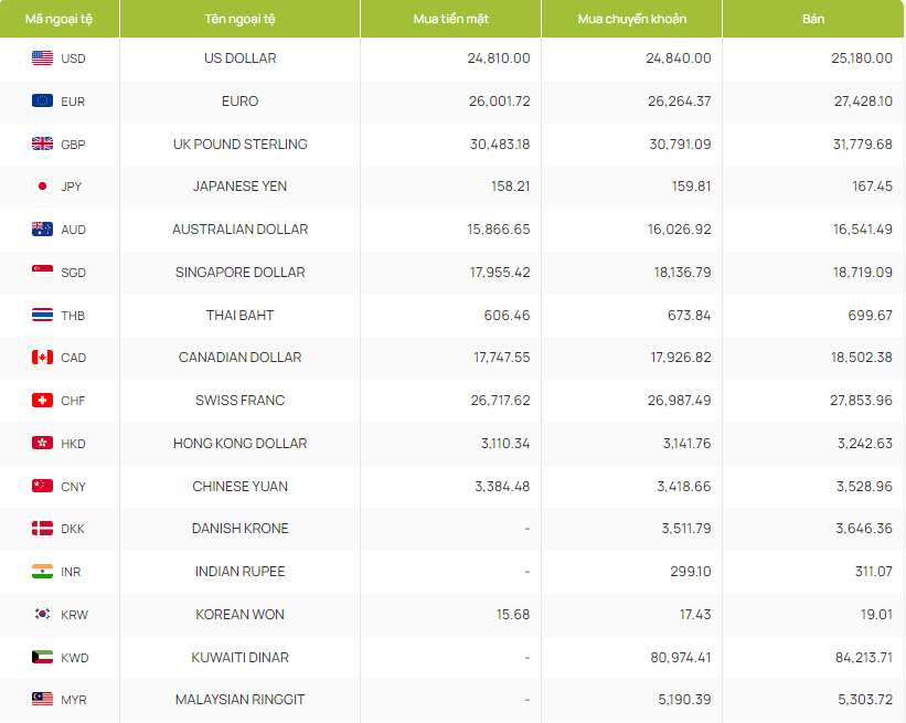 Tại Vietcombank, tỷ giá Won Vietcombank chiều mua vào và chiều bán ra ở mức 15,68 VND/KRW và 19,01 VND/KRW. Tỷ giá Won tại VietinBank, chiều mua vào và bán ra là 15,93 VND/KRW và 19,93 VND/KRW.
