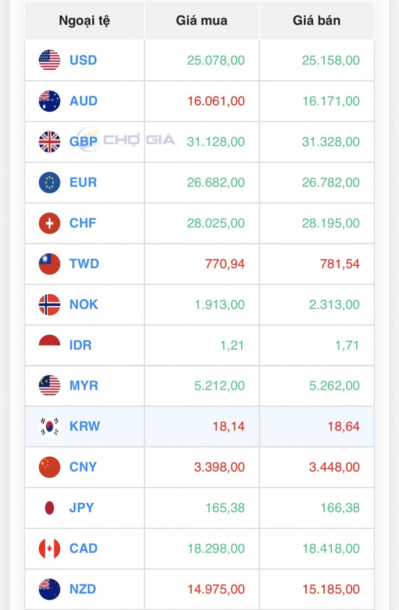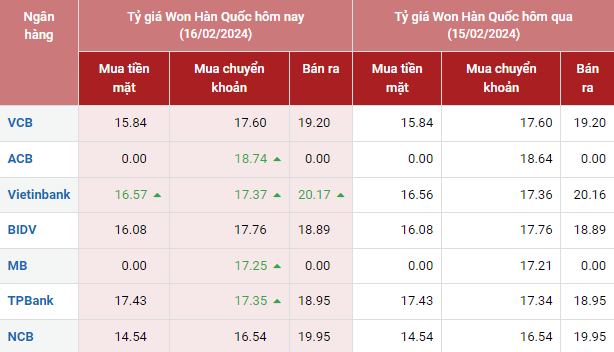 Theo khảo sát của Báo Công Thương sáng nay ngày 16/2/2024, tỷ giá Won VietinBank so với sáng qua (15/2), chiều mua vào và chiều bán tăng với mức giá là 16,54 VND/KRW và 20,14 VND/KRW. Còn tại Vietcombank, tỷ giá Won Vietcombank chiều mua vào và bán ra cũng tăng nhẹ ở mức 15,87 VND/KRW và 19,23 VND/KRW.