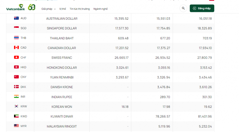 Với 8 ngoại tệ còn lại, khách hàng có thể giao dịch bằng hình thức chuyển khoản: Krone Đan Mạch (DKK), rupee Ấn Độ (INR), Dinar Kuwaiti (KWD), ringgit Malaysia (MYR), Krone Na Uy (NOK), Rúp Nga (RUB), Rian Ả-Rập-Xê-Út (SAR) và Krona Thụy Điển (SEK).