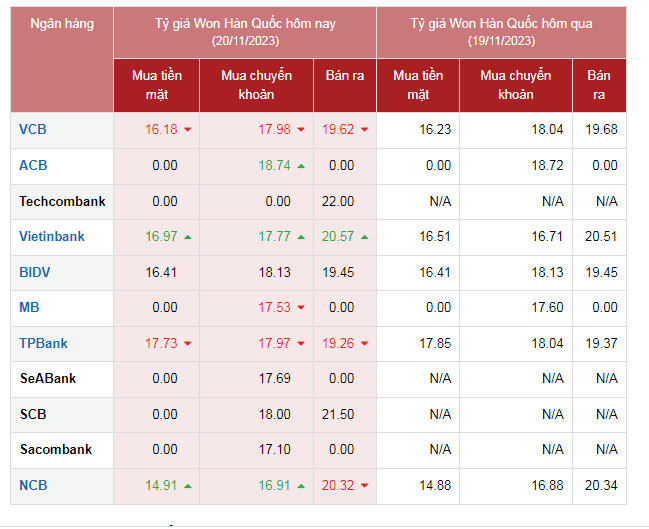 | Tỷ giá Won Hàn Quốc hôm nay 20/11/2023 khảo sát tại một số ngân hàng |