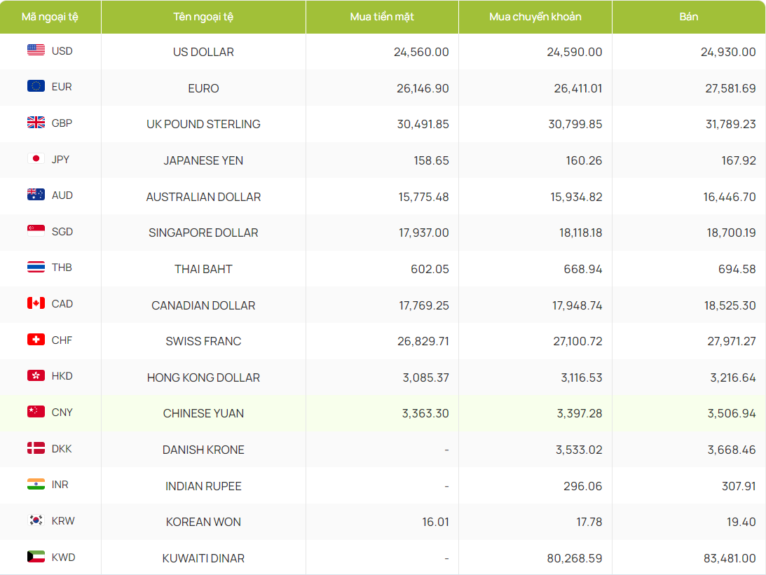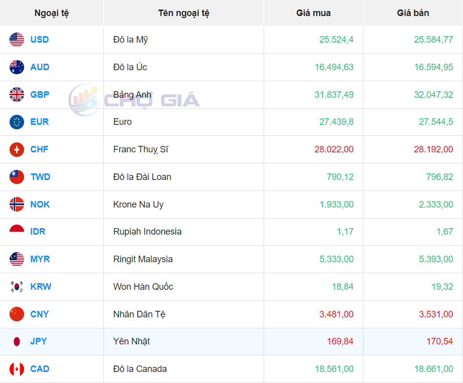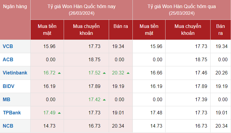 Tại Vietcombank, tỷ giá Won Vietcombank chiều mua vào và chiều bán ra ở mức 16,01 VND/KRW và 19,40 VND/KRW. Tỷ giá Won tại VietinBank, chiều mua vào và bán ra là 16,72 VND/KRW và 20,32 VND/KRW.