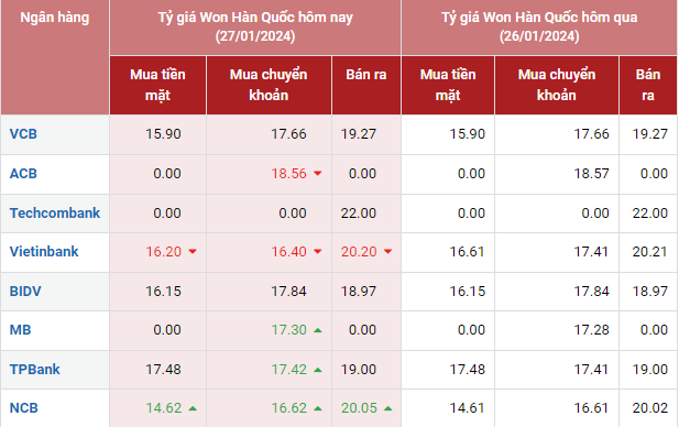 | Tỷ giá Won Hàn Quốc hôm nay 27/1/2024, vào lúc 8 giờ 30 phút tại các ngân hàng |