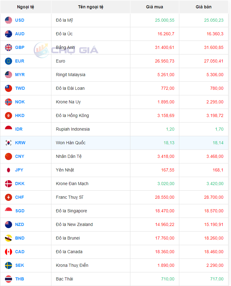 Ngân hàng Tiên Phong mua Won Hàn Quốc (KRW) giá cao nhất là 17,48 VNĐ/KRW. Bán Won Hàn Quốc (KRW) thấp nhất là Ngân hàng Tiên Phong với 19,00 VNĐ một KRW.