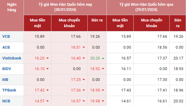 | Tỷ giá Won Hàn Quốc hôm nay 30/1/2024, vào lúc 7 giờ 00 phút tại các ngân hàng |