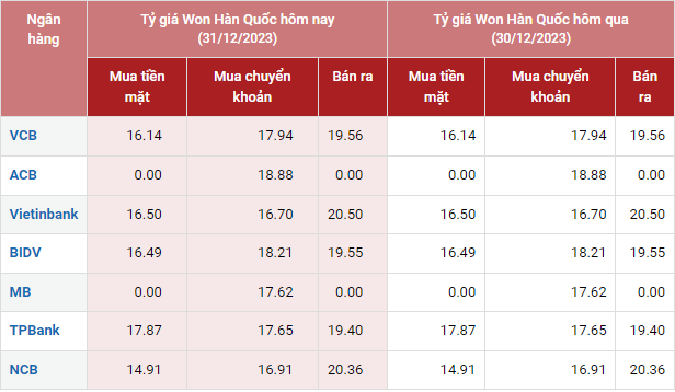 | Tỷ giá Won Hàn Quốc hôm nay 31/12/2023 lúc 7 giờ 00 phút tại các ngân hàng |
