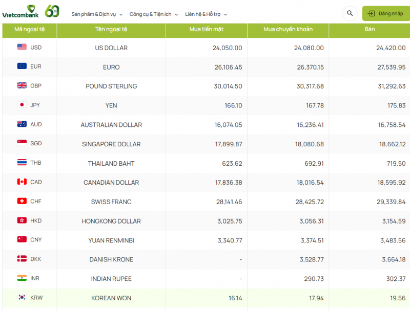 Trong số 20 ngoại tệ đang được giao dịch tại Vietcombank, chỉ có 12 loại tiền tệ được Vietcombank mua - bán bằng tiền mặt hoặc chuyển khoản đó là: Đô la Mỹ (USD), euro (EUR), nhân dân tệ (CNY), đô la Úc (AUD), bảng Anh (GBP), đô la Canada (CAD), franc Thuỵ Sĩ (CHF), đô la Singapore (SGD), Won Hàn Quốc (KRW), Yên Nhật (JPY), đô la HongKong (HKD), bath Thái Lan (THB).