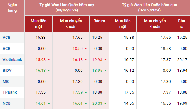 Hôm nay 3/2/2024 tỷ giá KRW ở chiều mua vào có 2 ngân hàng tăng giá mua, 1 ngân hàng giảm giá mua và 4 ngân hàng giữ nguyên giá mua vào so với hôm qua. Trong khi đó chiều bán ra có 2 ngân hàng tăng giá bán ra, 1 ngân hàng giảm giá bán và 4 ngân hàng giữ nguyên giá bán so với hôm qua.