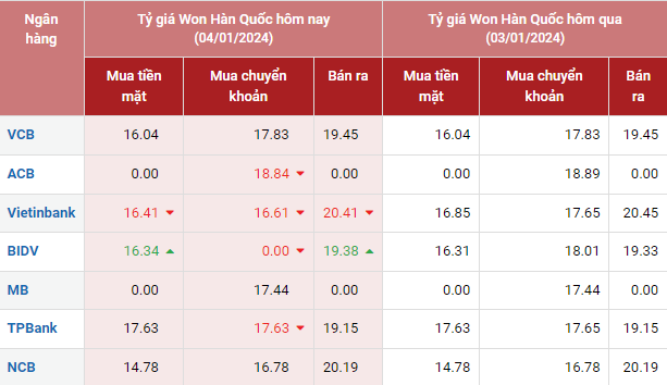 | Tỷ giá Won Hàn Quốc hôm nay 4/1/2024 lúc 6 giờ 00 phút tại các ngân hàng |