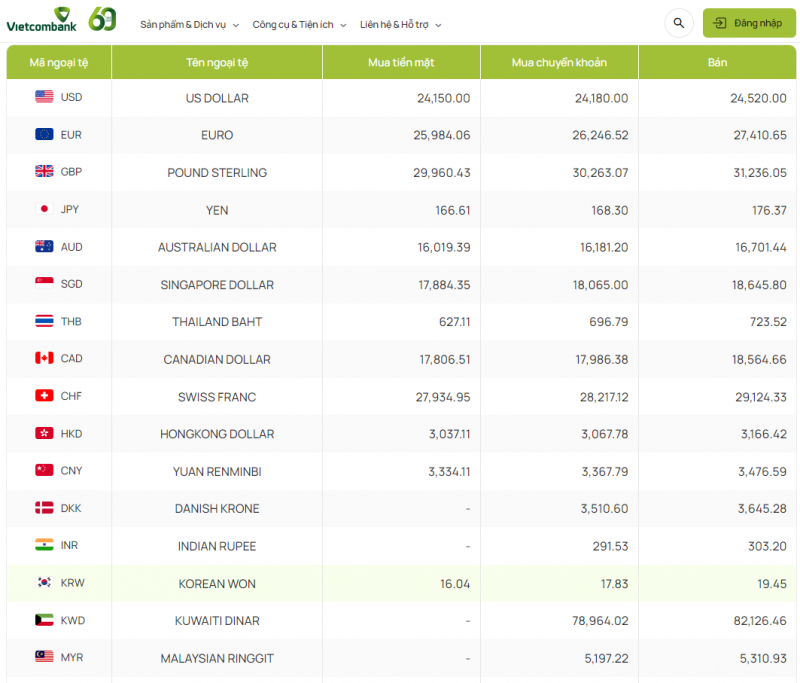 Trong số 20 ngoại tệ đang được giao dịch tại Vietcombank, chỉ có 12 loại tiền tệ được Vietcombank mua - bán bằng tiền mặt hoặc chuyển khoản đó là: Đô la Mỹ (USD), euro (EUR), nhân dân tệ (CNY), đô la Úc (AUD), bảng Anh (GBP), đô la Canada (CAD), franc Thuỵ Sĩ (CHF), đô la Singapore (SGD), Won Hàn Quốc (KRW), Yên Nhật (JPY), đô la HongKong (HKD), bath Thái Lan (THB).