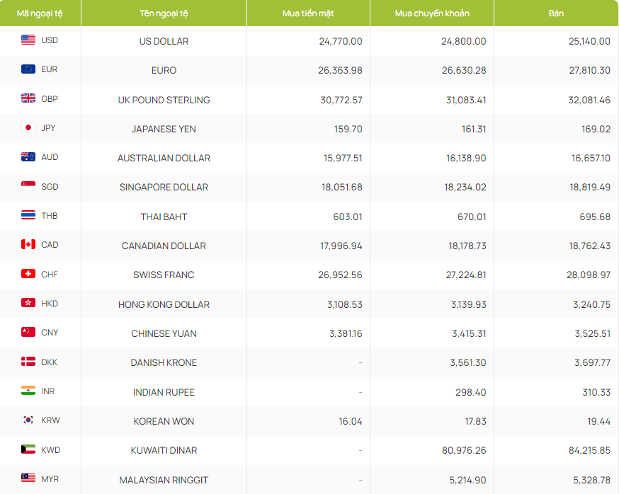 Tại Vietcombank, tỷ giá Won Vietcombank chiều mua vào và chiều bán ra ở mức 16,04 VND/KRW và 19,44 VND/KRW. Tỷ giá Won tại VietinBank, chiều mua vào và bán ra là 16,76 VND/KRW và 20,36 VND/KRW.