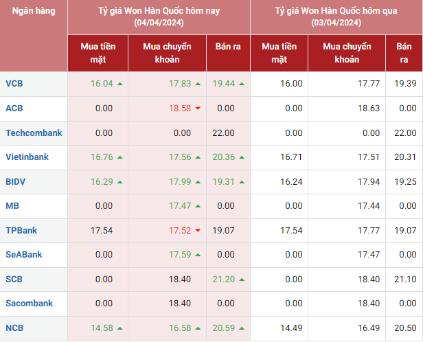 Hôm nay 4/4/2024, Ngân hàng Tiên Phong mua Won Hàn Quốc (KRW) giá cao nhất là 17.54 VNĐ/KRW. Bán Won Hàn Quốc (KRW) thấp nhất là Ngân hàng Quốc Dân với 20.59 VNĐ một KRW.