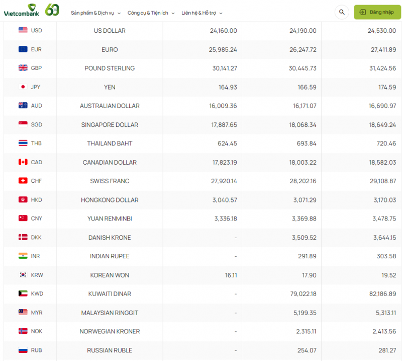 Trong số 20 ngoại tệ đang được giao dịch tại Vietcombank, chỉ có 12 loại tiền tệ được Vietcombank mua - bán bằng tiền mặt hoặc chuyển khoản đó là: Đô la Mỹ (USD), euro (EUR), nhân dân tệ (CNY), đô la Úc (AUD), bảng Anh (GBP), đô la Canada (CAD), franc Thuỵ Sĩ (CHF), đô la Singapore (SGD), Won Hàn Quốc (KRW), Yên Nhật (JPY), đô la HongKong (HKD), bath Thái Lan (THB).