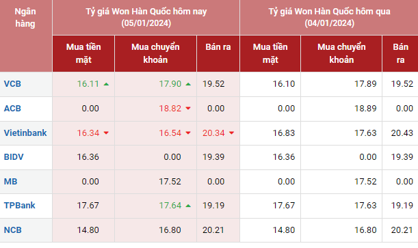 | Tỷ giá Won Hàn Quốc hôm nay 5/1/2024 lúc 5 giờ 30 phút tại các ngân hàng |