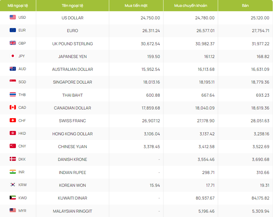 Tại Vietcombank, tỷ giá Won Vietcombank chiều mua vào và chiều bán ra ở mức 15,94 VND/KRW và 19,31 VND/KRW. Tỷ giá Won tại VietinBank, chiều mua vào và bán ra là 16,62 VND/KRW và 20,22 VND/KRW.