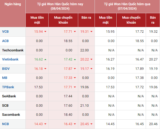 Hôm nay 8/4/2024, Ngân hàng Tiên Phong mua Won Hàn Quốc (KRW) giá cao nhất là 17.53 VNĐ/KRW. Bán Won Hàn Quốc (KRW) thấp nhất là Ngân hàng Quốc Dân với 20.45 VNĐ một KRW