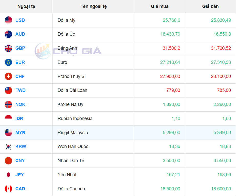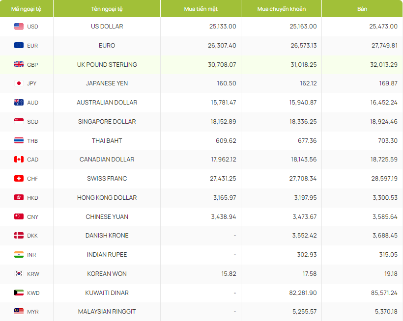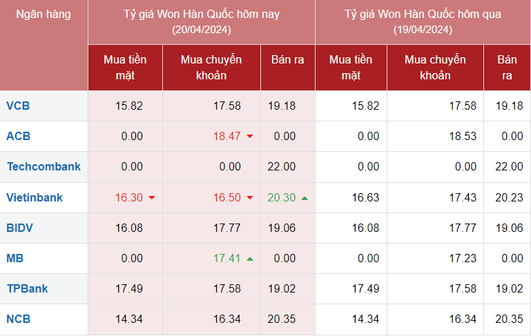 Tại Vietcombank, tỷ giá Won Vietcombank chiều mua vào và chiều bán ra ở mức 15,82 VND/KRW và 19,18 VND/KRW. Tỷ giá Won tại VietinBank, chiều mua vào và bán ra là 16,30 VND/KRW và 20,30 VND/KRW.