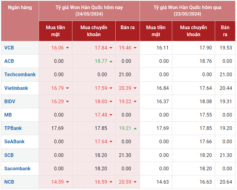 Tại Vietcombank, tỷ giá Won Vietcombank chiều mua vào và chiều bán ra ở mức 16,06 VND/KRW và 19,46 VND/KRW. Tỷ giá Won tại VietinBank, chiều mua vào và bán ra là 16,79 VND/KRW và 20,39 VND/KRW.