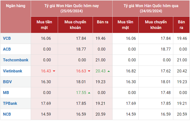 Tại Vietcombank, tỷ giá Won Vietcombank chiều mua vào và chiều bán ra ở mức 16,06 VND/KRW và 19,46 VND/KRW. Tỷ giá Won tại VietinBank, chiều mua vào và bán ra là 16,43 VND/KRW và 20,43 VND/KRW.