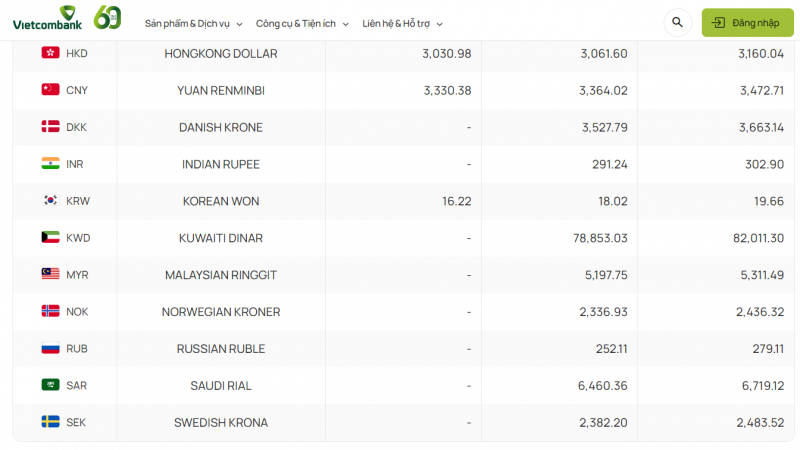 Với 8 ngoại tệ còn lại, khách hàng có thể giao dịch bằng hình thức chuyển khoản: Krone Đan Mạch (DKK), rupee Ấn Độ (INR), Dinar Kuwaiti (KWD), ringgit Malaysia (MYR), Krone Na Uy (NOK), Rúp Nga (RUB), Rian Ả-Rập-Xê-Út (SAR) và Krona Thụy Điển (SEK).