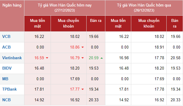 | Tỷ giá Won Hàn Quốc hôm nay 27/12/2023 |
