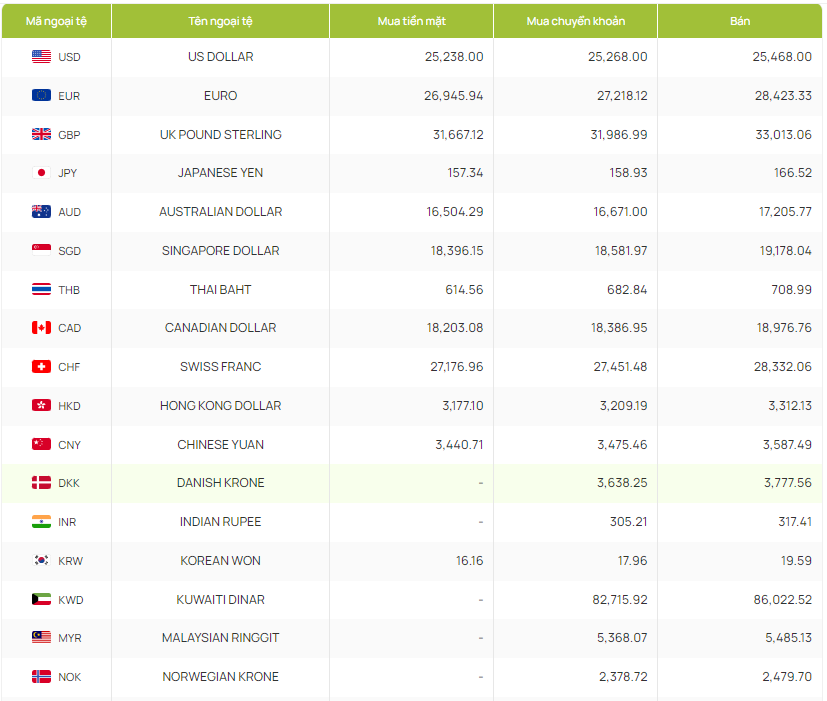 | Tỷ giá ngoại tệ hôm nay 28/5/2024 tại ngân hàng Vietcombank. (Ảnh chụp màn hình lúc 10h) |