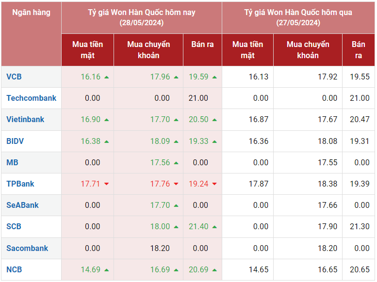 Hôm nay 28/5/2024, Ngân hàng Tiên Phong mua Won Hàn Quốc (KRW) giá cao nhất là 17,71 VND/KRW. Bán Won Hàn Quốc (KRW) thấp nhất là Ngân hàng TPBank với giá 19,24 VND/KRW.