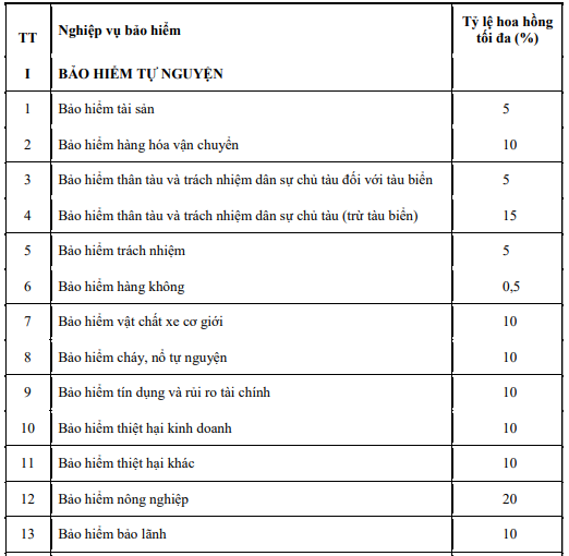Bảo hiểm tài sản tối đa 5%; Bảo hiểm hàng hóa vận chuyển tối đa 10%; Bảo hiểm thân tàu và trách nhiệm dân sự chủ tàu đối với tàu biển tối đa 5%; Bảo hiểm thân tàu và trách nhiệm dân sự chủ tàu (trừ tàu biển) tối đa 15%; Bảo hiểm trách nhiệm tối đa 5%; Bảo hiểm hàng không tối đa 0,5%; Bảo hiểm vật chất xe cơ giới tối đa 10%; Bảo hiểm cháy, nổ tự nguyện tối đa 10%; Bảo hiểm tín dụng và rủi ro tài chính tối đa 10%; Bảo hiểm thiệt hại kinh doanh tối đa 10%; Bảo hiểm thiệt hại khác tối đa 10%; Bảo hiểm nông nghiệp tối đa 20%; Bảo hiểm bảo lãnh tối đa 10%.
