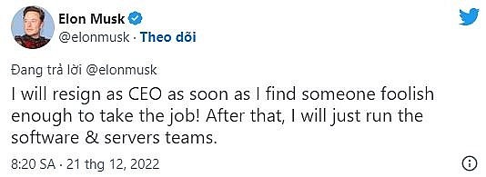 Ngày 18/12, tỷ phú Mỹ cũng nói ông chưa thể chọn ra người phù hợp lãnh đạo Twitter vì "không ai muốn một công việc thực sự để giữ Twitter tồn tại, không có người kế vị". Theo ông, "người muốn quyền lực lại là người ít xứng đáng với nó nhất".
