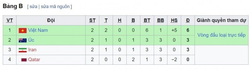 Giành trọn 6 điểm qua hai lượt trận, lúc này thầy trò huấn luyện viên Hoàng Anh Tuấn đang 'chễm chệ' ở ngôi đầu bảng B, đứng sau lần lượt là Australia (3 điểm), Iran (3 điểm). Còn Qatar xếp cuối với 0 điểm và gần như đã bị loại.