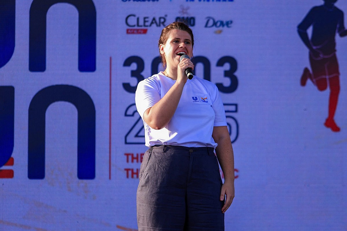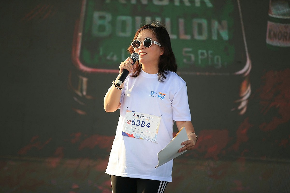 | Bà Lê Thị Hồng Nhi - Phó Tổng giám đốc Truyền thông, Đối ngoại và Phát triển bền vững của Unilever Việt Nam phát biểu tại BritCham Fun Run 2025. |