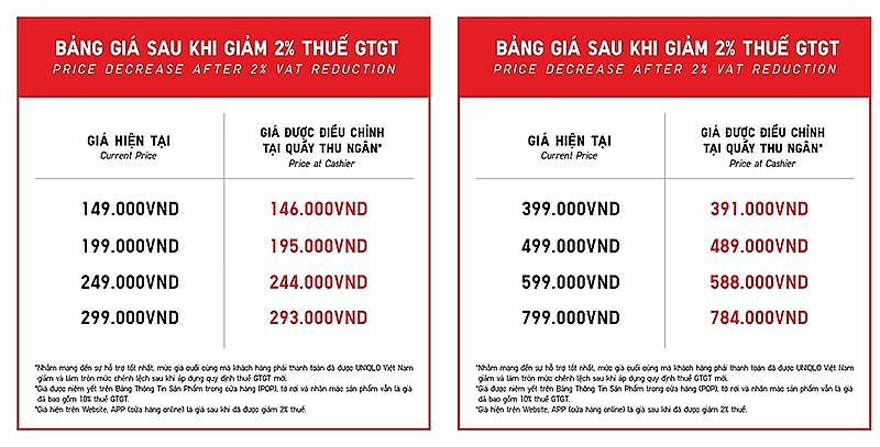 Cụ thể, từ khi mua sắm tại tất cả các cửa hàng của UNIQLO bao gồm cả cửa hàng UNIQLO online, các khách hàng sẽ nhận được khoản tương đương 2% với những hướng dẫn cụ thể như sau: Với các cửa hàng bán lẻ trực tiếp, giá được giảm trực tiếp tại quầy thu ngân khi khách hàng thực hiện thanh toán; Giá được niêm yết trên bảng thông tin sản phẩm trong cửa hàng (POP), tờ rơi và nhãn mác sản phẩm vẫn là giá đã bao gồm 10% thuế GTGT.