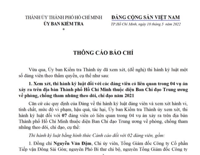 Chiều 23/5, Ủy ban Kiểm tra Thành ủy TP.Hồ Chí Minh có thông tin về xem xét, thi hành kỷ luật 7 đảng viên liên quan trong 4 vụ án xảy ra trên địa bàn thuộc diện Ban Chỉ đạo phòng chống tham nhũng trung ương theo dõi, chỉ đạo năm 2021.