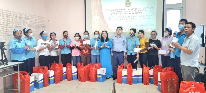 | Đại diện Công đoàn ngành Công Thương và Công đoàn công ty CP Giầy Hồng Bảo trao quà cho đoàn viên, người lao động có hoàn cảnh khó khăn |