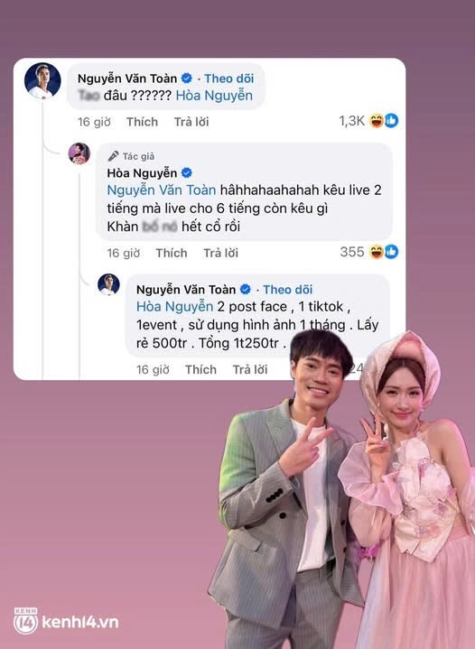 "2 post đăng Facebook quảng cáo MV, 1 dự sự kiện, sử dụng hình ảnh một tháng, lấy rẻ 500 triệu", Văn Toàn hài hước chia sẻ. Cộng với số tiền nợ gốc, tổng số tiền mà Hoà Minzy nợ anh lên đến 1 tỷ 250 triệu đồng.