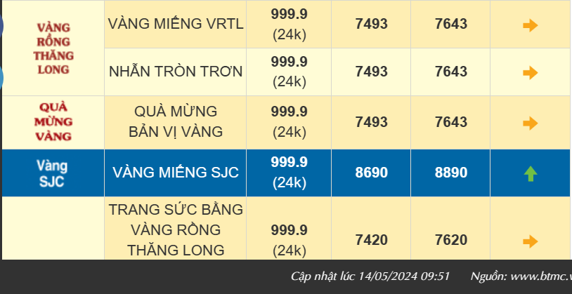 Giá vàng trong nước thời điểm trưa ngày 14/5, giá vàng miếng SJC điều chỉnh mỗi nơi mỗi giá.