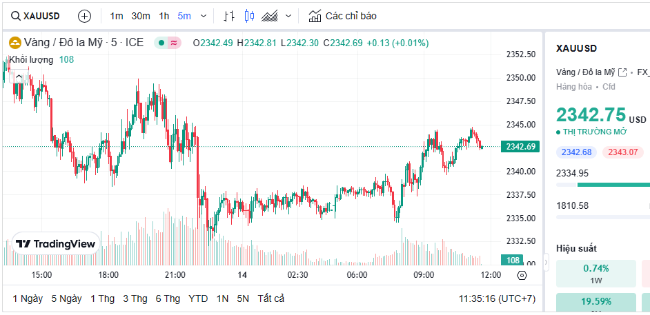 Trên thị trường thế giới, giá vàng thời điểm trưa ngày 14/5, giá vàng giao ngay giảm tới 21 USD/ounce so với đầu giờ sáng qua, xuống mức 2.342 USD/ounce. Quy đổi theo tỷ giá VND/USD hiện hành, giá vàng quốc tế tương đương với khoảng 71,5 triệu đồng/lượng (chưa bao gồm thuế, phí).