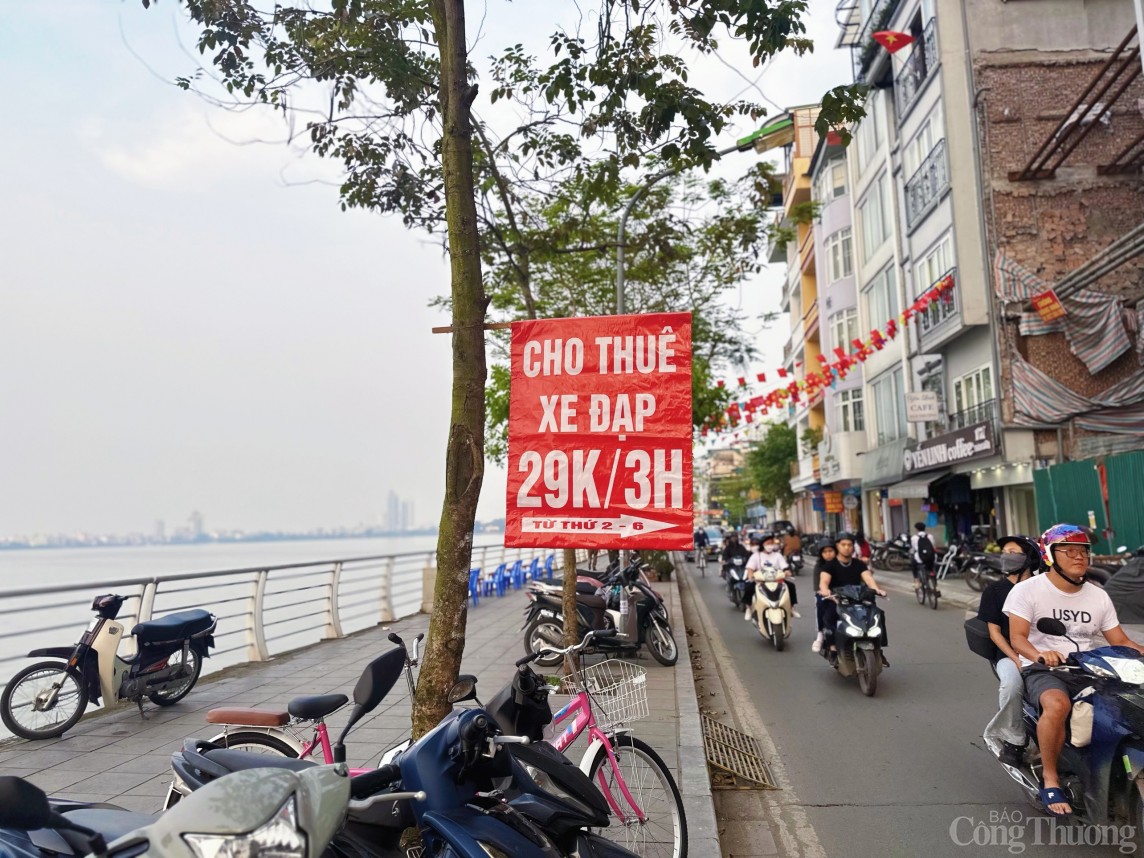 Với mức giá bình dân, ngày càng nhiều người đổ về Hồ Tây vui chơi, đạp xe đạp mỗi buổi chiều. Để kiểm soát tốt hoạt động kinh doanh cũng như bảo vệ tài sản cho thuê, các khách hàng khi thuê sẽ phải để lại giấy tờ tùy thân hoặc gửi xe tại quán thì không phải cọc.