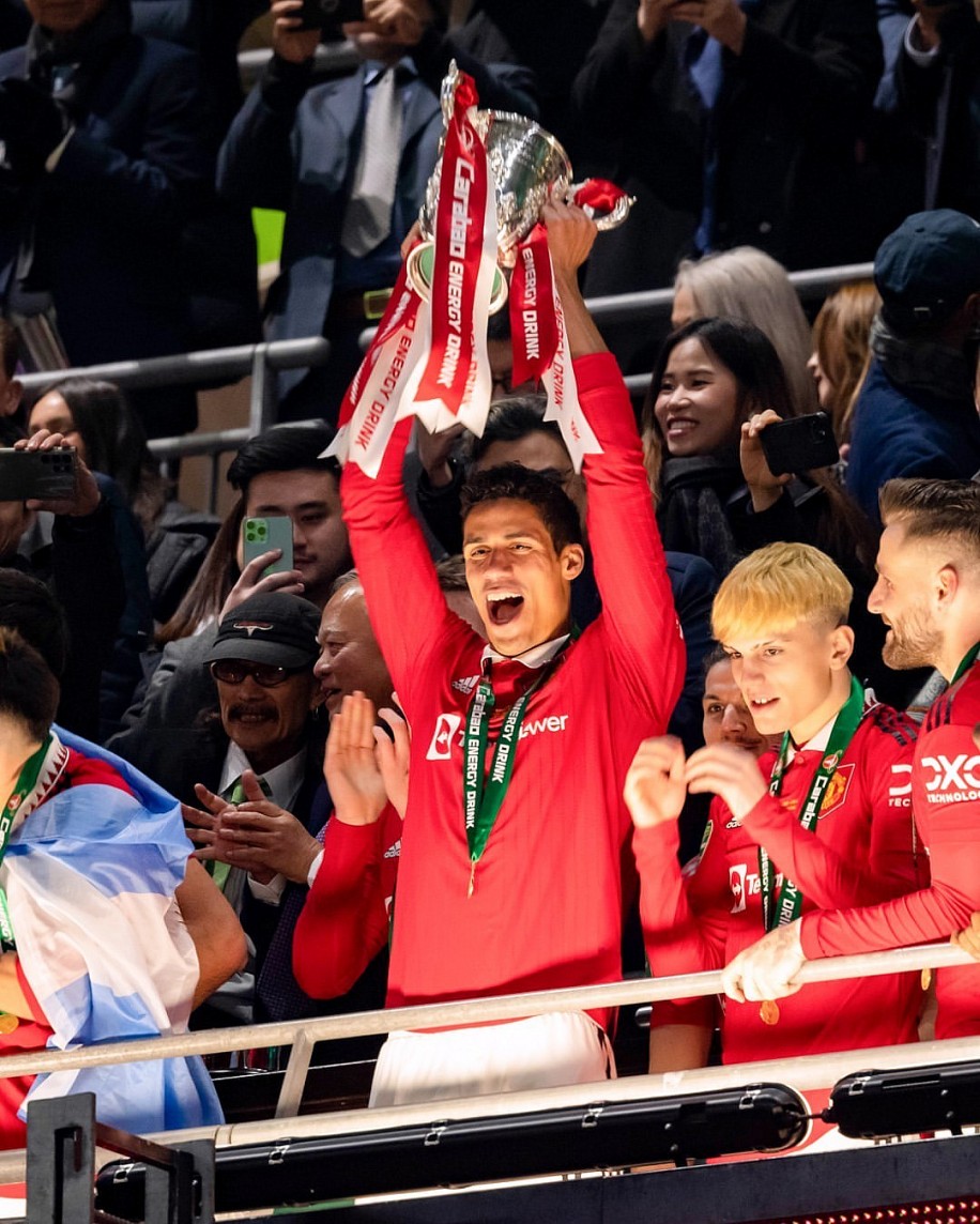 | Varane nâng cao chức vô địch Carabao Cup 2023 cùng các đồng đội |