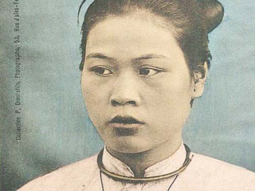 CôngThương - Bức ảnh chụp năm 1906 khắc họa một phụ nữ Việt Nam mặc áo dài, đeo kiềng vàng, vấn tóc cao.